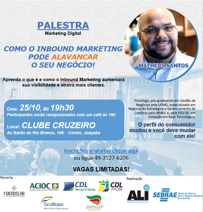 Inscrições Gratuitas no site: https://www.sympla.com.br/palestra-marketing-digital-com-matheus-santos__198265