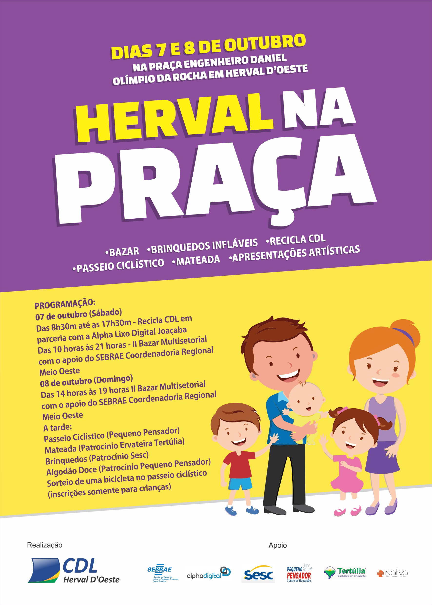 Dias 07 e 08 de Outubro na Praça Engenheiro Daniel Olímpio da Rocha em Herval d’Oeste, terá a seguinte programação: II Bazar Multissetorial, Brinquedos Infláveis, Recicla CDL, Passeio Ciclístico, Mateada, sorteio de brinquedos e Apresentações Artísticas.